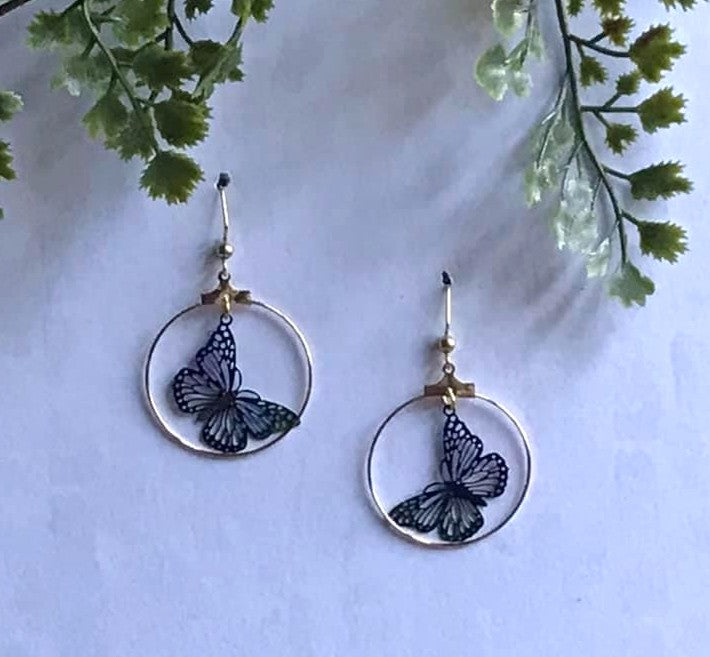 Dainty, lightweight, colorful...these iridescent, filigree, gold tone earrings add a touch of elegant whimsy to any outfit!  Choose from a beautiful butterfly, dragonfly, or cat and moon silhouette encircled within a delicate gold toned hoop suspended from a gold french hook ear wire.  A graceful earring statement!